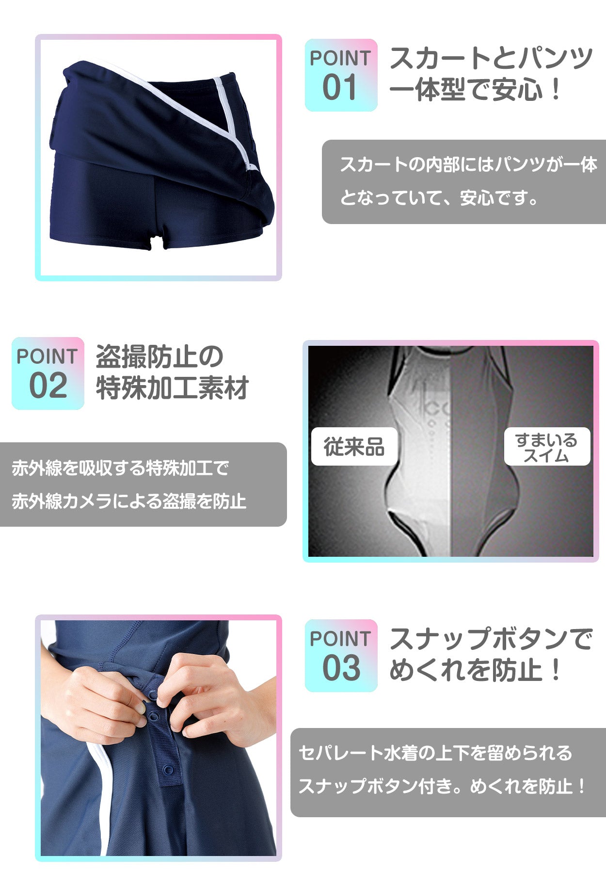 すまいるスイムは、はっ水加工による「体の冷えにくさ」と「水にぬれた時の軽さ」、赤外線を吸収する特殊加工による「盗撮防止」が特徴のスクール水着です。