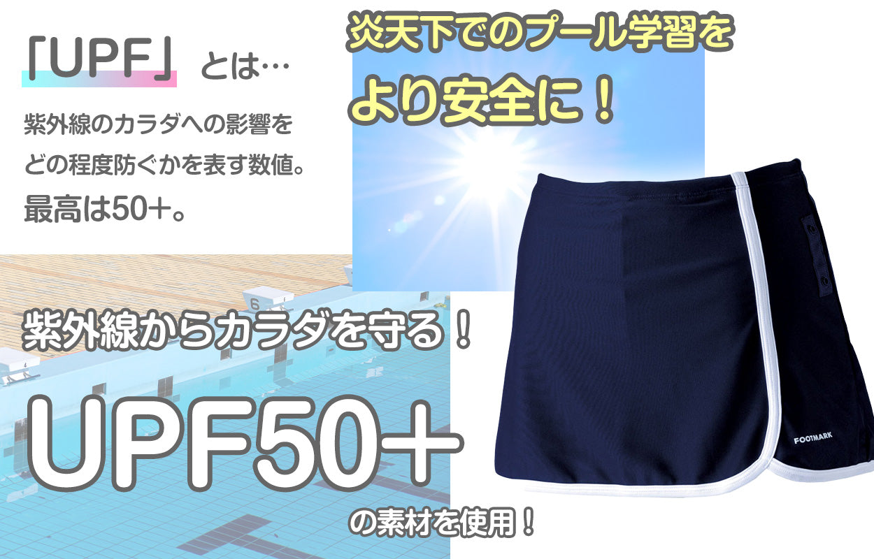 紫外線対策としてUVカットに優れた(UPF50+)素材を使用しています。日焼け防止、炎天下でのプール学習も安心です。