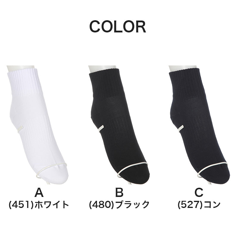 足のニオイが気にならない「抗菌防臭」付き。また、動いても靴下がずり落ちにくいので、よく動くときにおすすめ。