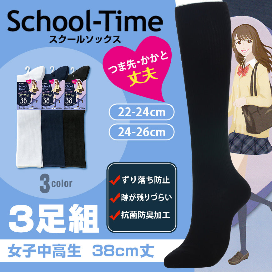 スクールソックス 無地 ハイソックス 38cm丈 3足組 22-24cm・24-26cm
