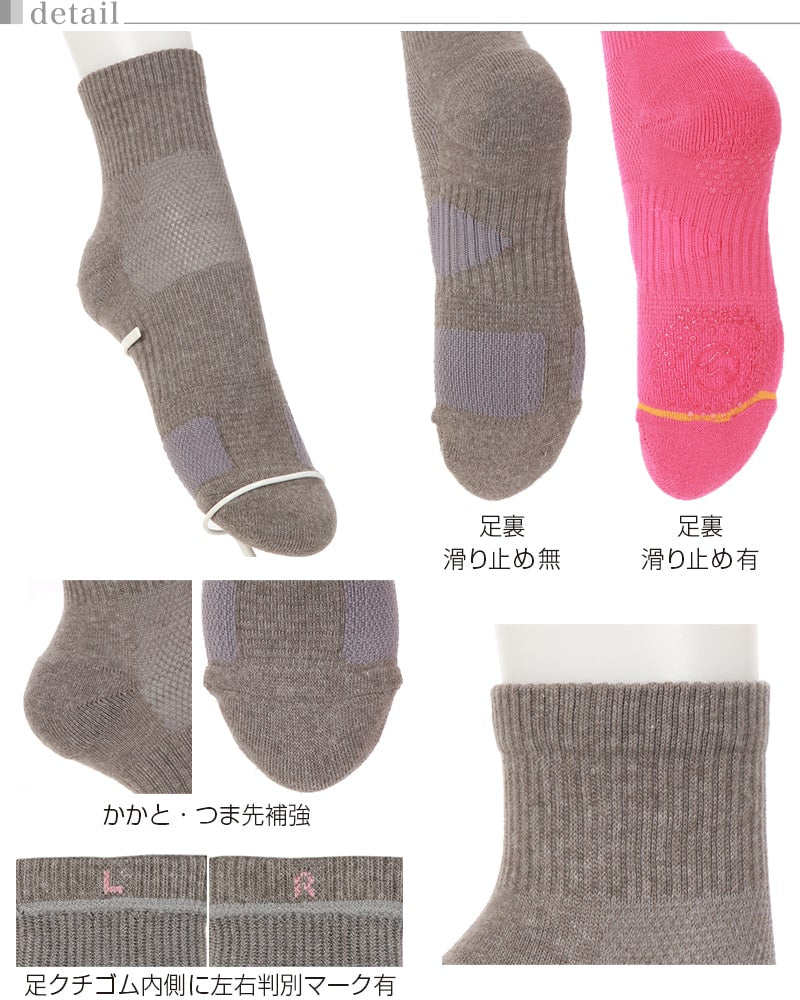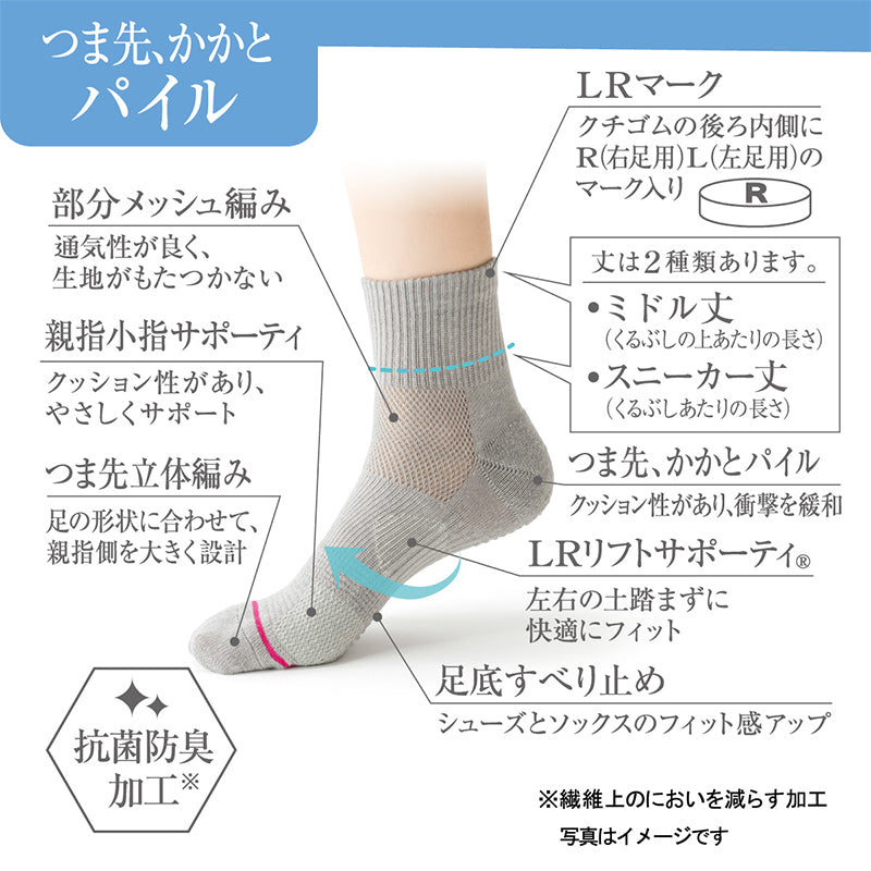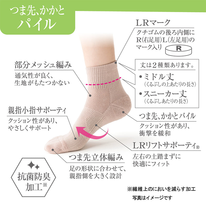 綿混、左右編み分け仕様、つま先立体編み、はきぐちLRマーク付、部分メッシュ編み、つま先・かかとパイル、かかと付、足底すべり止め(あり・なし)、LRリフトサポーティ、ワイドヒール、抗菌防臭加工