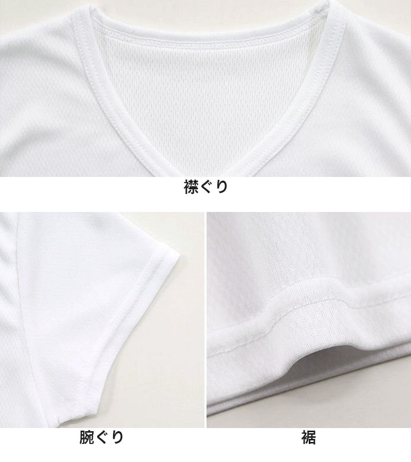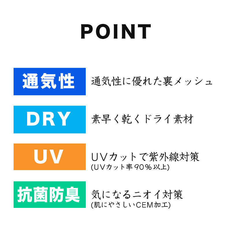 洗濯に強い/型崩れしにくい/乾きやすい(ドライ素材)/シワになりにくい/裏メッシュ素材(通気性)/UVカット(UVカット率90%以上)/制菌防臭効果/同色2枚組