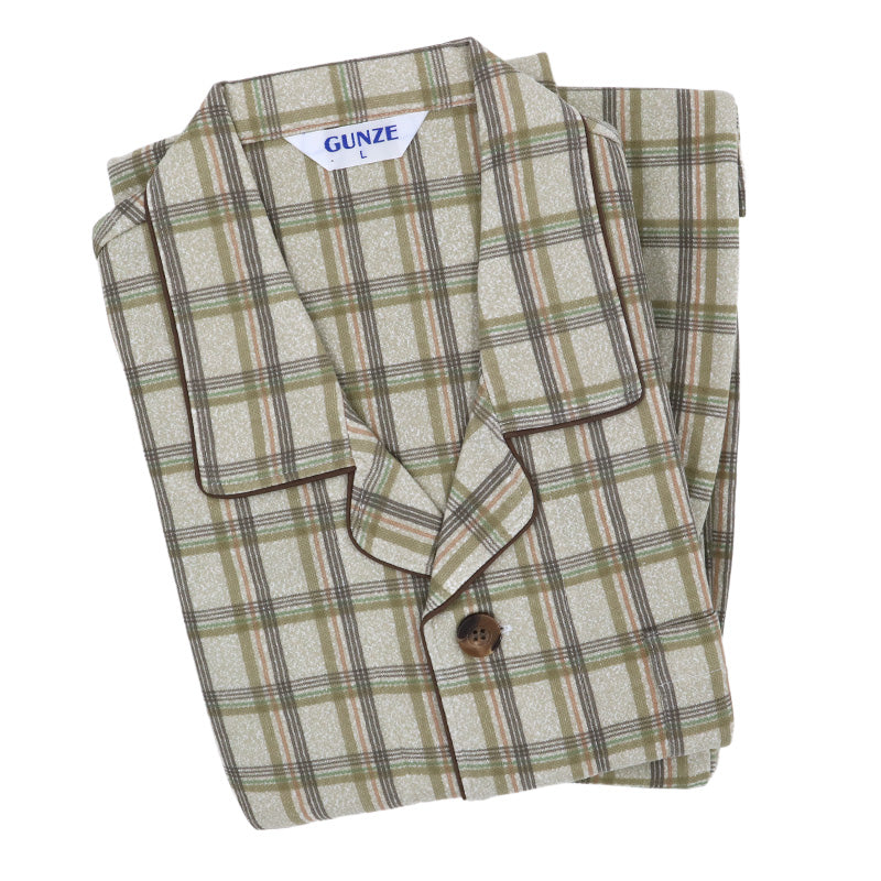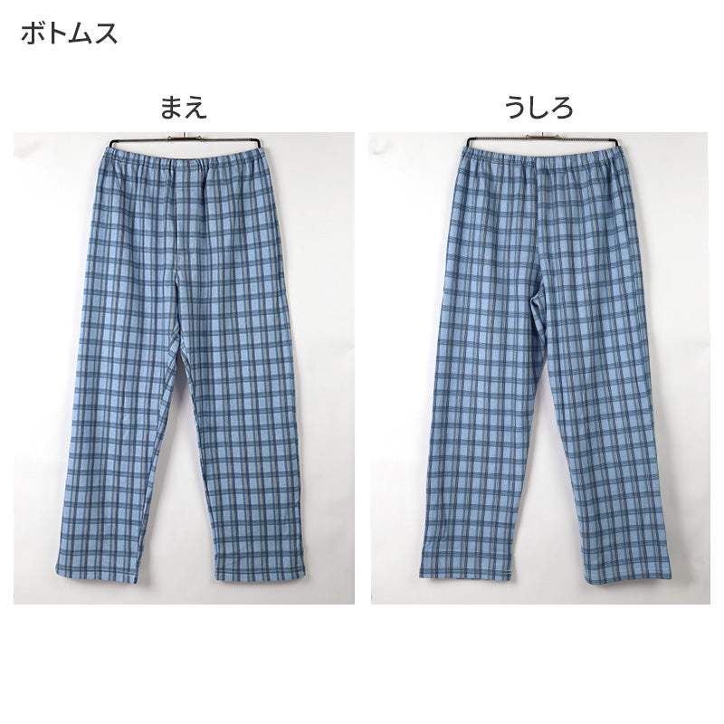 前あきボタン仕様、袖口・足口にゴム通し穴を備えた実用性も充実したメンズ用ルームウェアです。