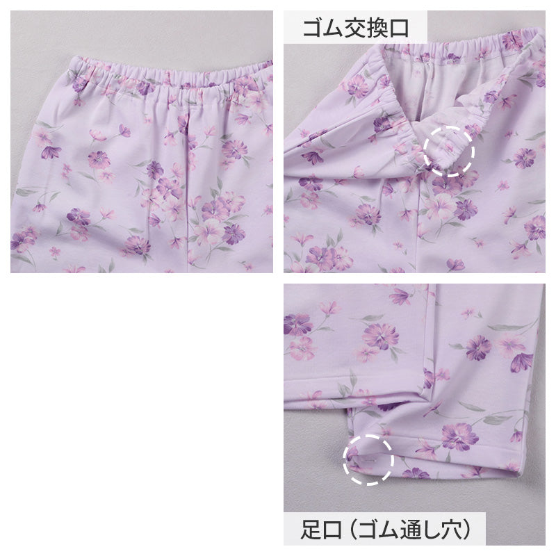 袖口・足口にゴム通し穴を備えた実用性も充実したレディース用ルームウェアです。