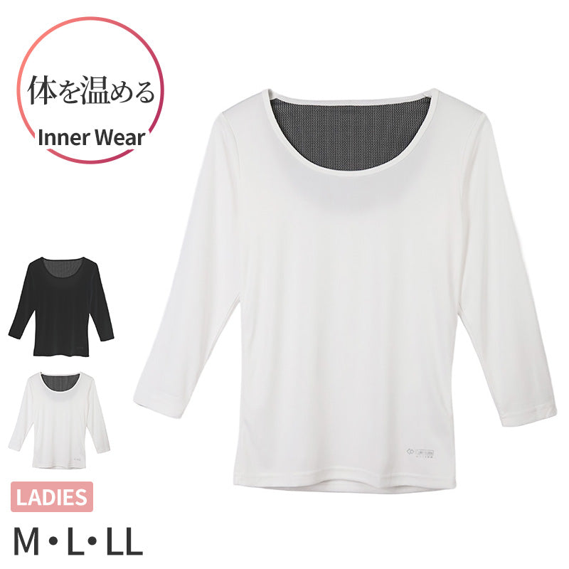 レディース インナー 8分袖 Uネック M L LL 遠赤外線 保温 あったか 発熱 冷え対策 温活 エナジーストーン 黒 白 冷え性 インナーシャツ レディース長袖 発熱素材 保温インナー 快適 暖かい