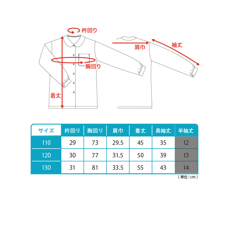 スナップボタンタイプのシャツは、110cm、120cm、130cmをご用意しました。