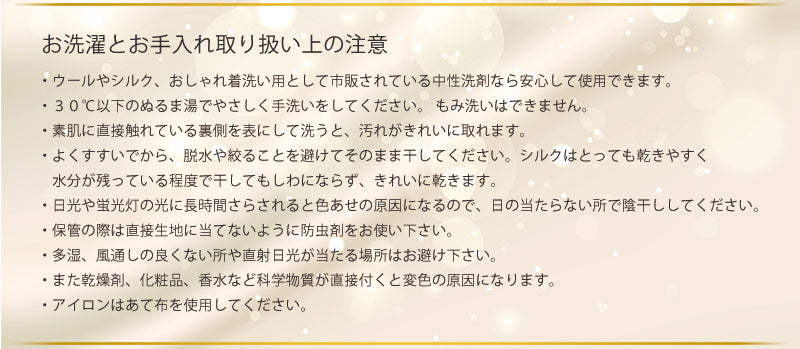 ※絹は天然繊維の性質上、お洗濯の際に伸びたり縮んだりする可能性がございます。