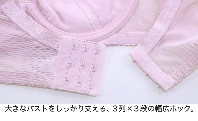 脇高ダブルボーン(お肉の脇流れ防止)/見えても綺麗な花柄ストレッチレース(伸縮性あり)/通気性抜群(メッシュパワーネット仕様)/幅広ホック/幅広ストラップ/パッドポケット無し