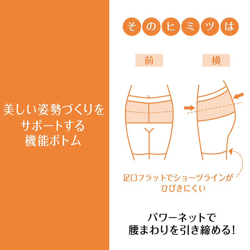 骨盤ベルト付き(骨盤サポートパワーネット)/ヒップアップ/吸汗速乾加工/ナイロン2way生地/トリコット/洗濯表示直接プリント(タグレス/タグなし)/足口フラット/1枚履き可能