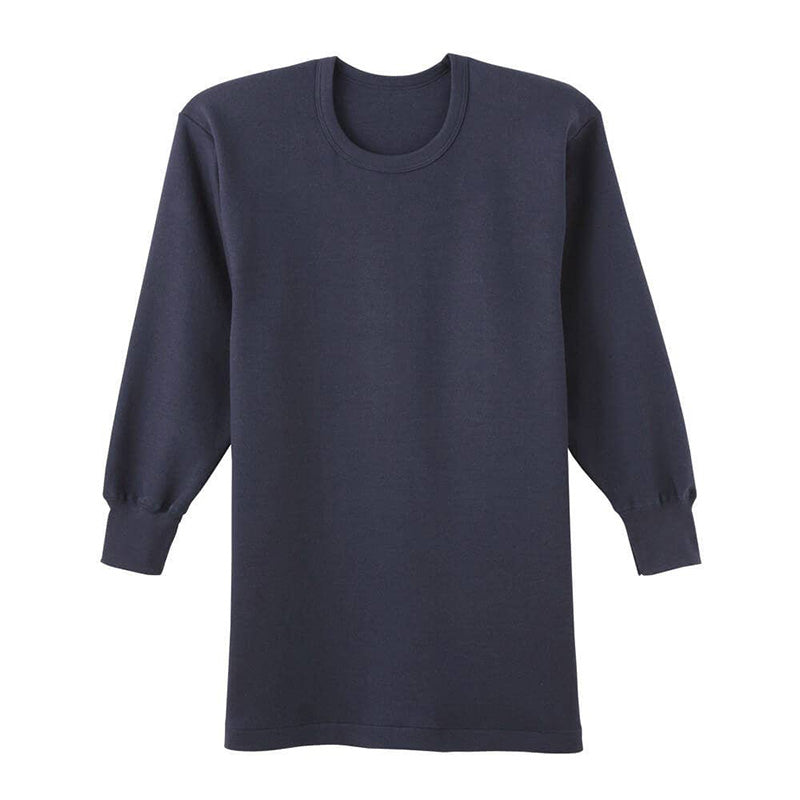 快適工房の紳士コットンバルキー長袖丸首シャツは、天然素材の柔らかさと保温性を兼ね備えた冬の定番インナーです。