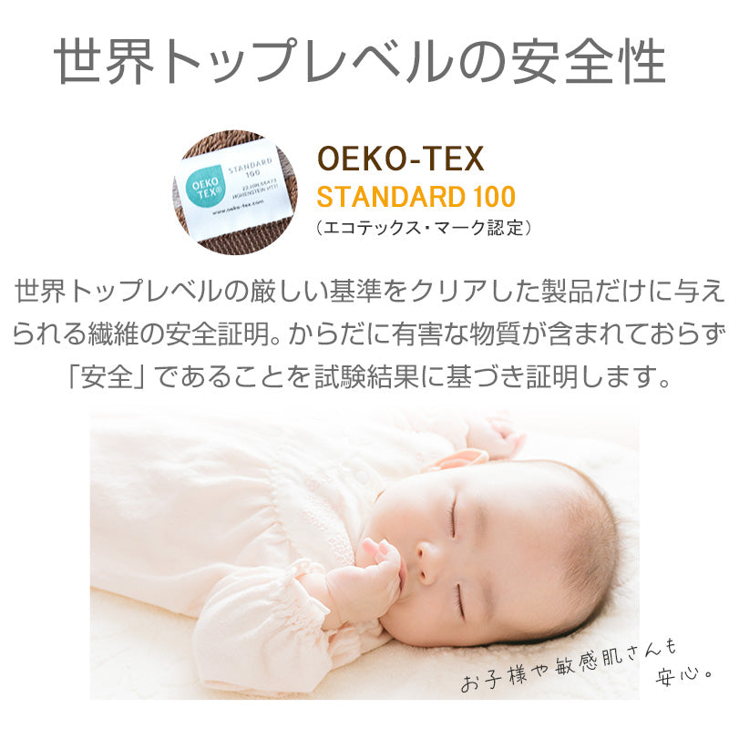 世界トップレベルの厳しい基準をクリアした製品だけに与えられる繊維の安全証明、エコテックスマーク認定。(0EKO-TEX STANDARD100)