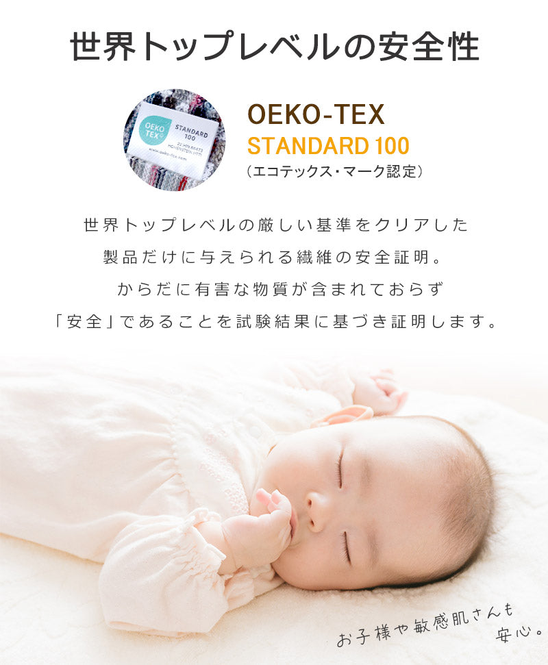 ※「エコテックス」とは、世界トップレベルの厳しい基準をもって、繊維製品の安心・安全を証明するものです