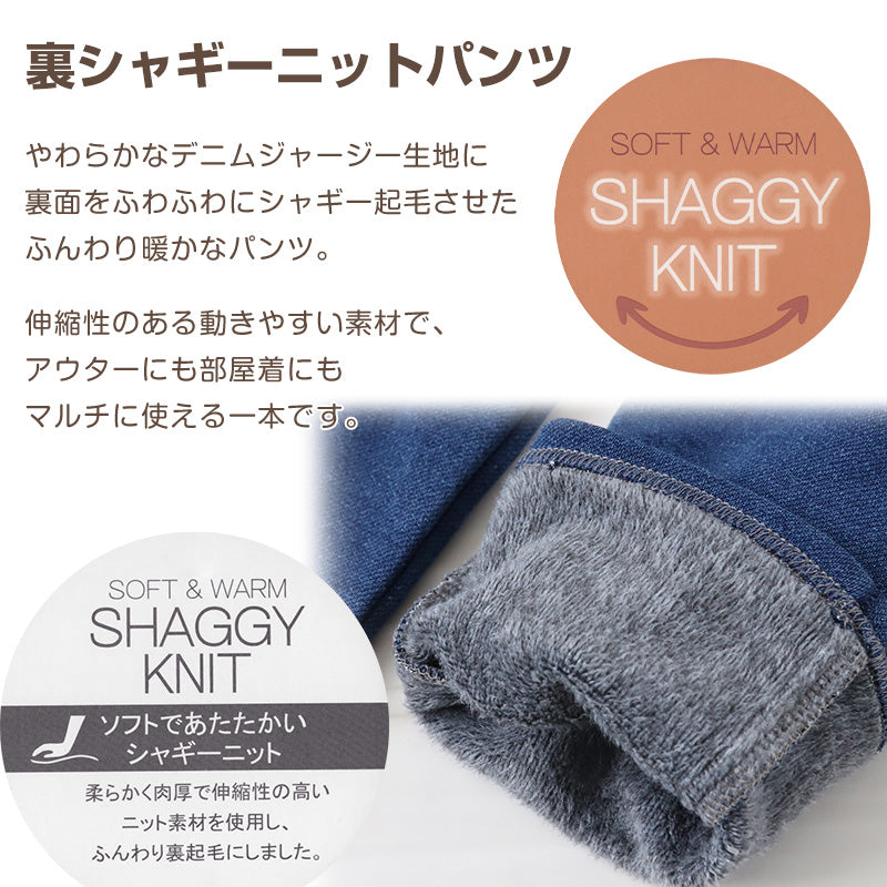 冬の定番素材、肉厚のやわらかなデニムジャージー生地に内側はふわふわなシャギー起毛で、とっても暖かい♪