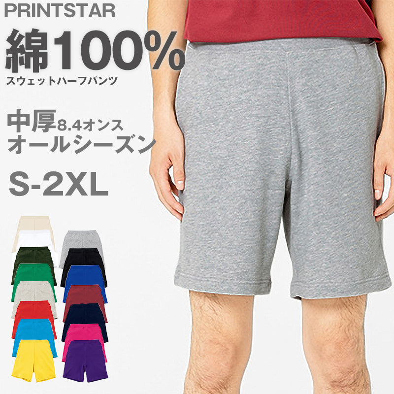 男女兼用 ユニセックス スウェット ハーフパンツ 半ズボン 綿100% 無地 裏パイル 裏毛 吸水性 8.4オンス スポーツ 運動 コットン 白 黒 グレー 赤 青 ベージュ 緑 ネイビーピンク 黄色 紫 S M L LL 3L S~2XL
