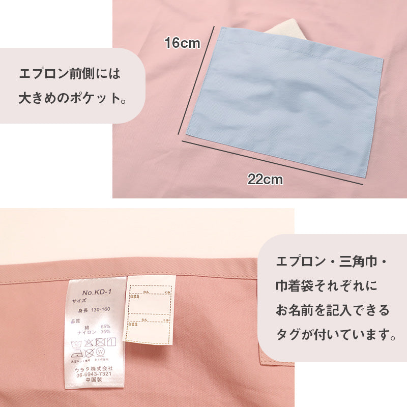 キッズ エプロン 3点セット 100-120cm 130-160cm 男の子 女の子 子供用 子ども 小学生 小学校 中学生 ポケット付き 巾着袋 三角巾 キッズエプロン 家庭科