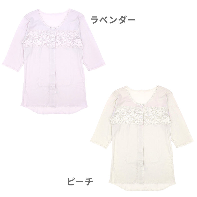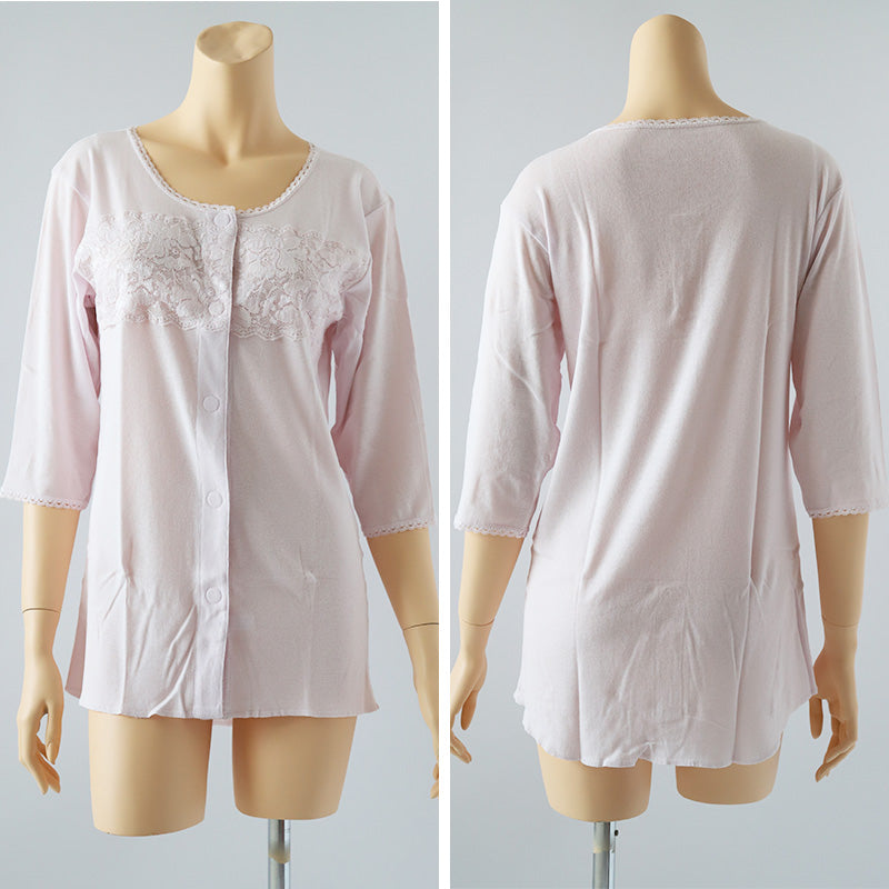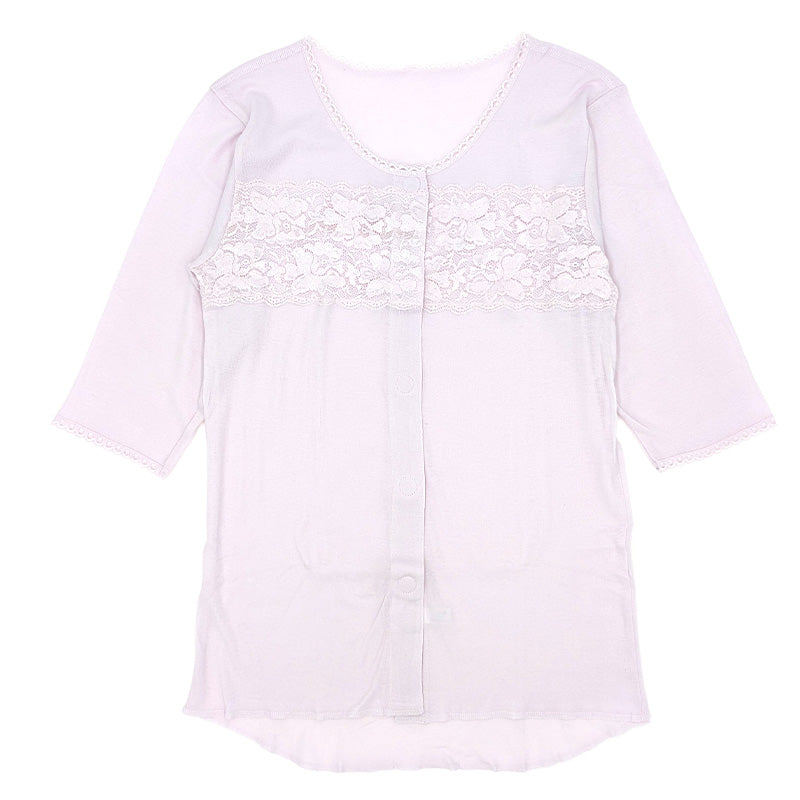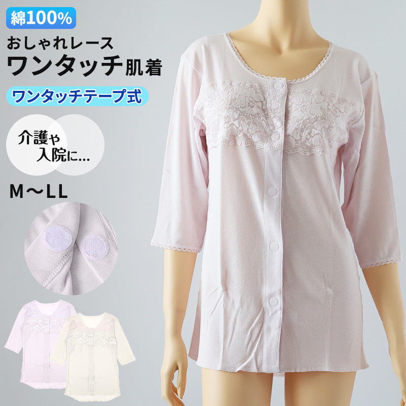 ワンタッチ 介護 肌着 前開き マジックテープ レディース M~LL 7分袖 レース 前あき肌着 入院 寝巻き インナー 介護シャツ ピンク m l ll