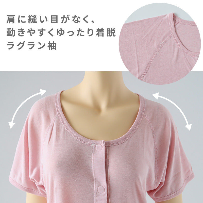 ワンタッチ 介護 肌着 前開き マジックテープ レディース M~LL 3分袖 ラグラン袖 前あき肌着 入院 寝巻き インナー 介護シャツ ピンク m l ll