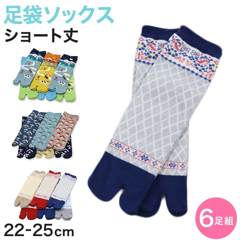 アウトレット レディース 足袋ソックス ショート丈 6足組 22-25cm 綿混 足袋 タビ 足袋靴下 足袋型靴下 くつ下 くつした 日本製 柄 欧風 キャンプ (在庫限り)