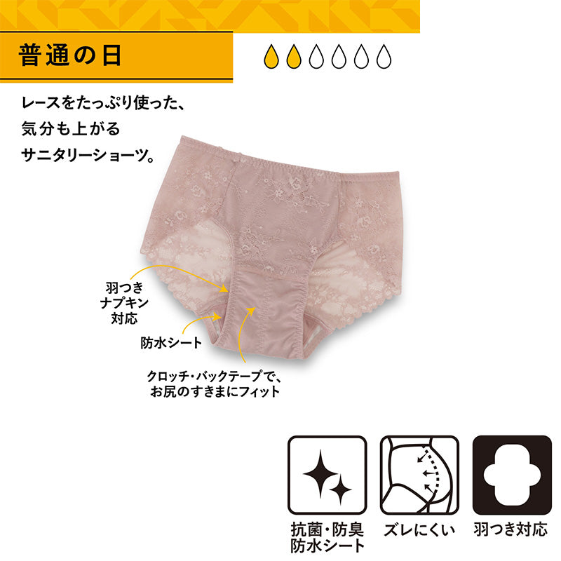 こちらのショーツは透湿加工された通気性のよい防水シートを使用しており、蒸れにくいのでブルーデイも快適に過ごせます。