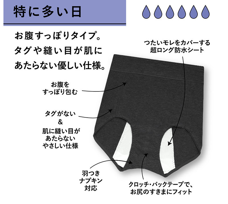 お腹をすっぽり包む深ばきタイプ。冷え対策におすすめの超ロング防水シートサニタリーショーツです。