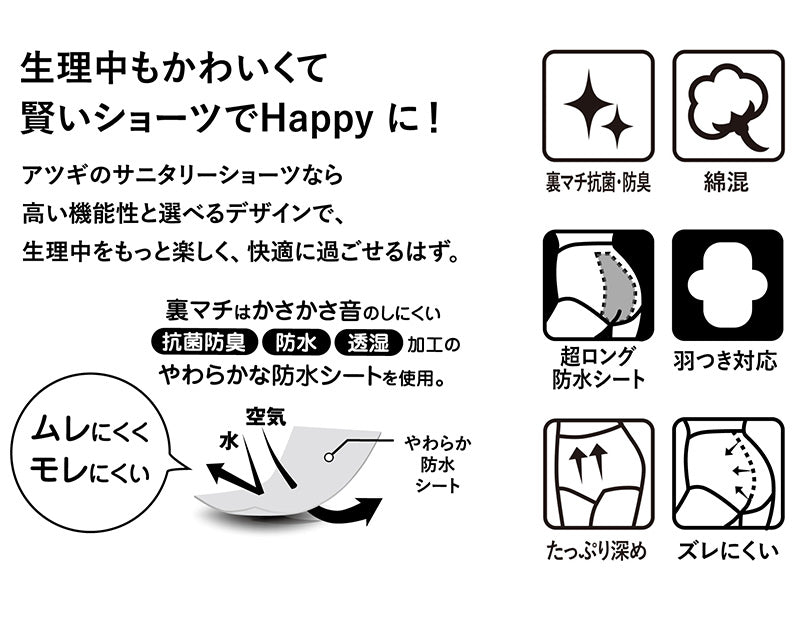 こちらのショーツは透湿加工された通気性のよい防水シートを使用しており、蒸れにくいのでブルーデイも快適に過ごせます。