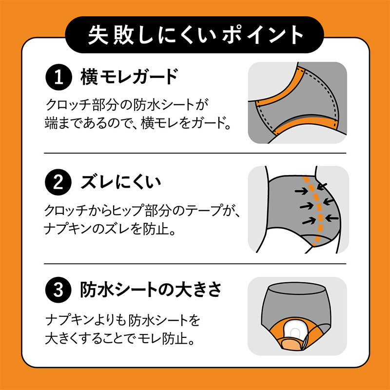 浮きクロッチ(マチ)仕様で羽根つきナプキンに対応しており、マチに折り込んで収納できてナプキンがズレにくいので横モレの心配がありません。