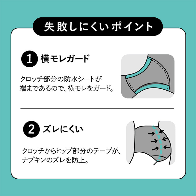 浮きクロッチ(マチ)仕様で羽根つきナプキンに対応しており、マチに折り込んで収納できてナプキンがズレにくいので横モレの心配がありません。