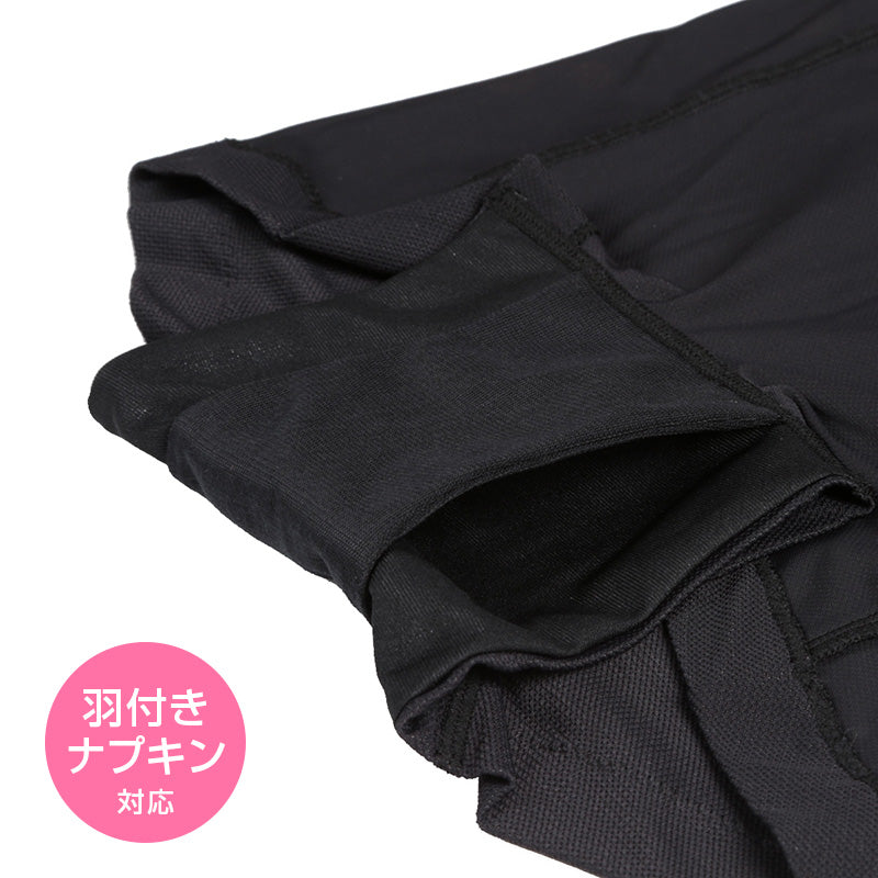 浮きクロッチ(マチ)仕様で羽根つきナプキンに対応しており、マチに折り込んで収納できてナプキンがズレにくいので横モレの心配がありません。