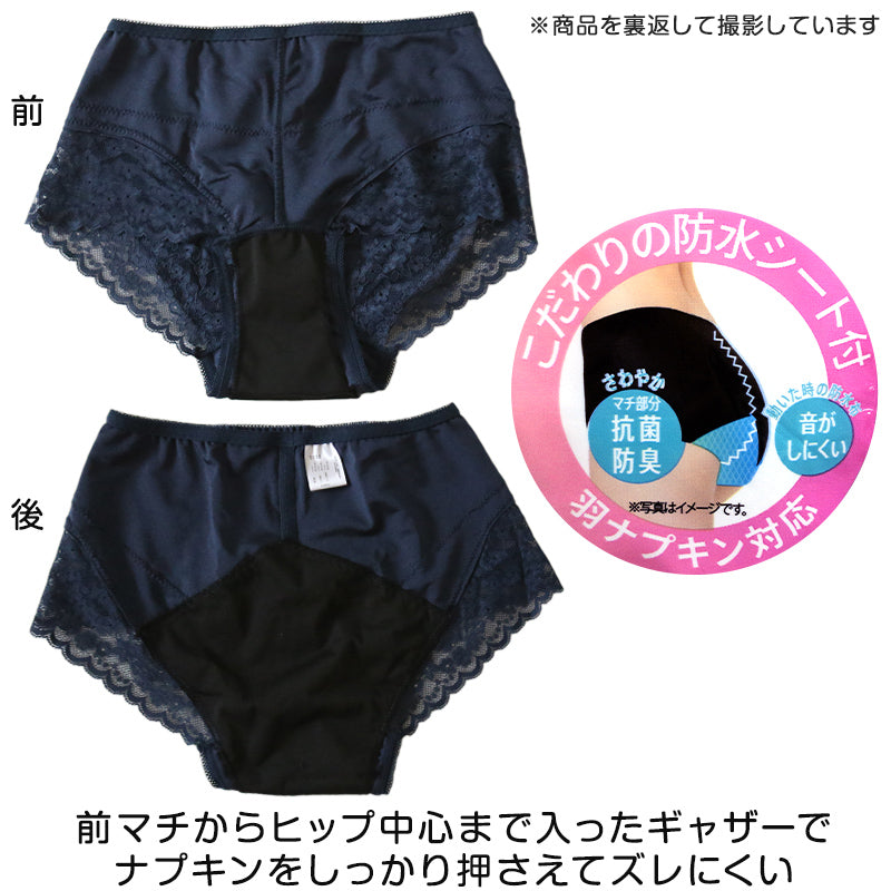 前マチからヒップ中心まで入ったギャザーで、ナプキンをしっかり押さえてズレにくい仕様です。
