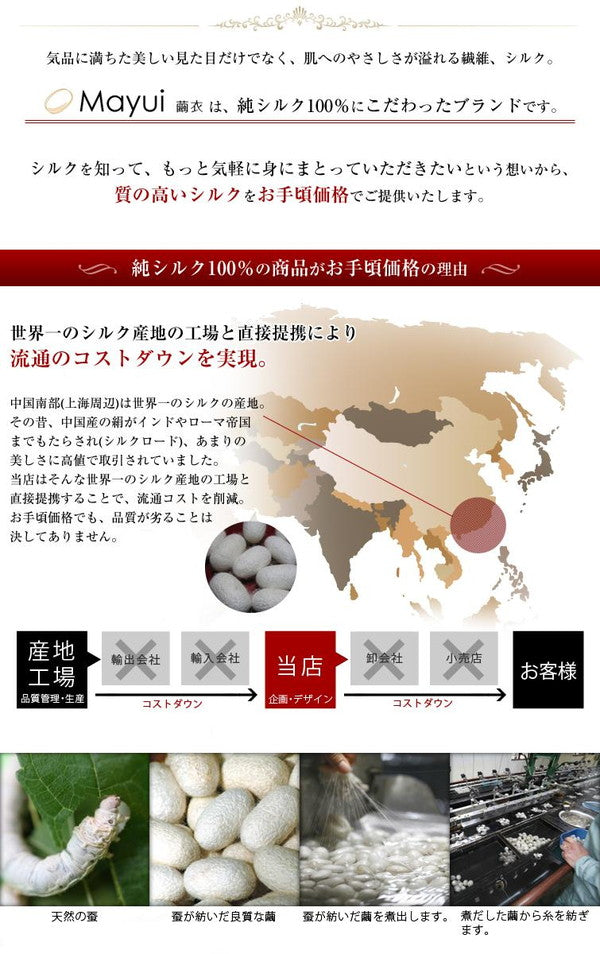 世界一のシルク産地の中国南部(上海周辺)の工場と直接提携しているので、お手頃価格でも品質には自信があります。