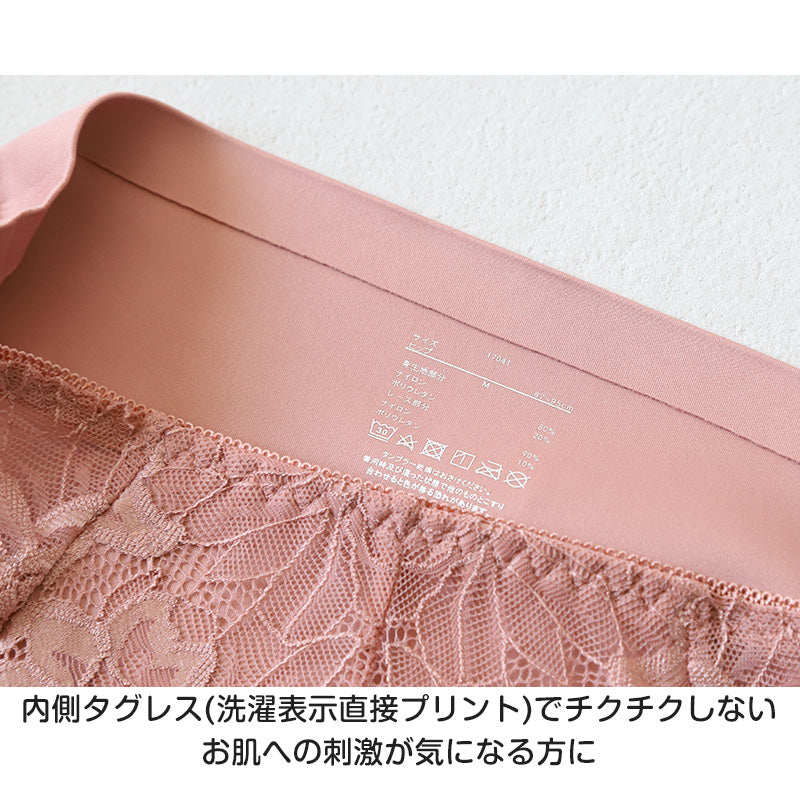 「圧着」や「切りっぱなし」を採用した、段差の目立たないエレガントなレースショーツです。