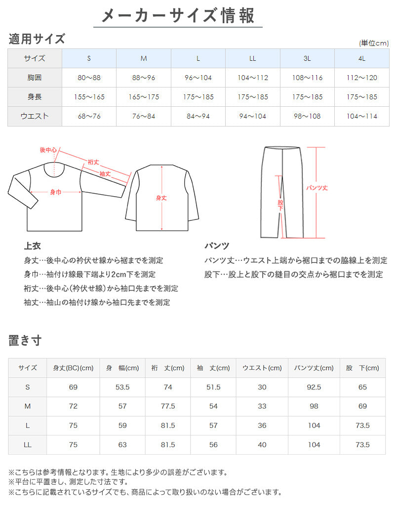 LL(身長:175~185cm 胸囲:104~112cm ウエスト:94~104cm)