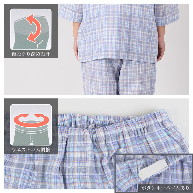 パンツは前開き仕様で、大きめのボタンを採用しているため、寝ぼけていてもスムーズに着替えや着脱ができます。