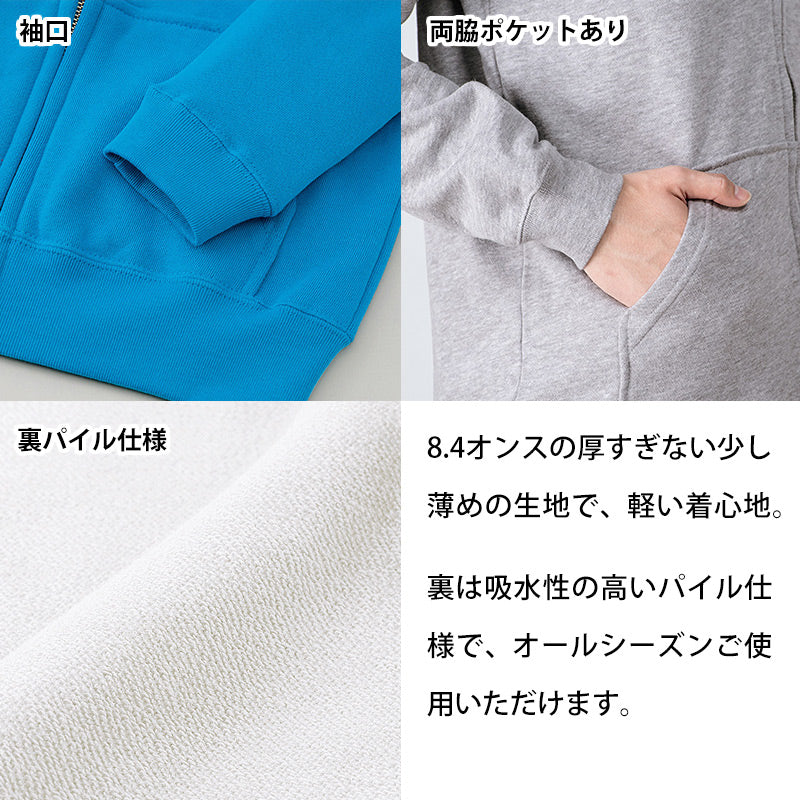 パーカーとしては厚すぎない、やや薄い8.4オンスの生地で、軽い着心地です。
