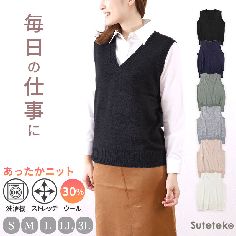 オフィス ベスト vネック ニット 洗える レディース ジレ チョッキ セーター スーツ 無地 シンプル S M L LL 3L