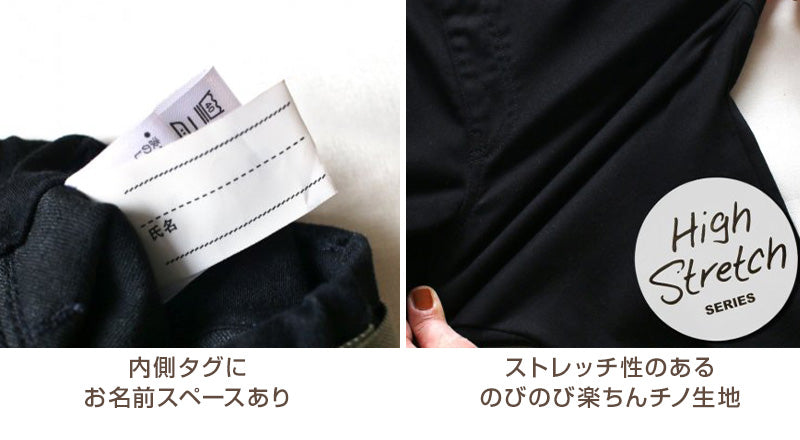 サイドポケット×2(内側にミニポケット×1)/バックポケット×2/ウエストゴム仕様(取替え口あり)/お名前スペースあり