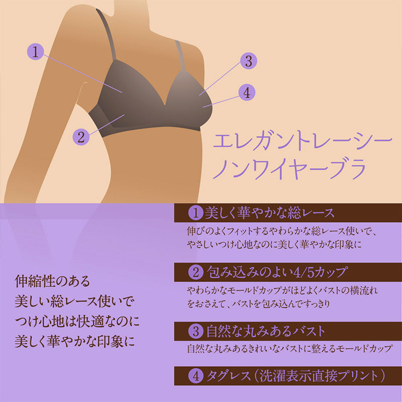 ノンワイヤー、総レース(伸縮性あり)、モールドカップ、タグレス(洗濯表示直接プリント)