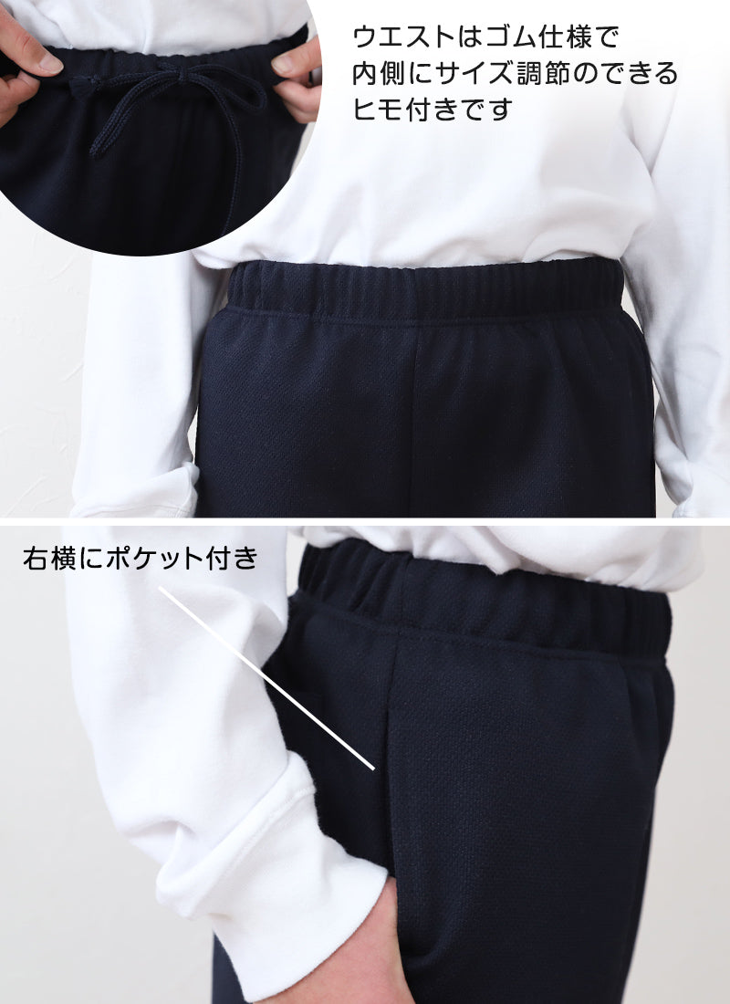 吸汗速乾/ウエストゴム仕様、調節ヒモ付き(ゴム取替不可)/右横、右後ろにポケット/ネームタグ付き