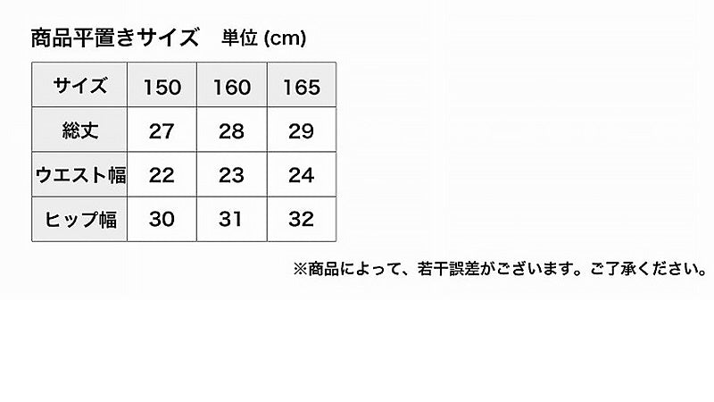 - 150cm(身長目安:145-155cm/ヒップ:76-84cm/総丈:27cm/ウエスト幅:22cm/ヒップ幅:30cm)