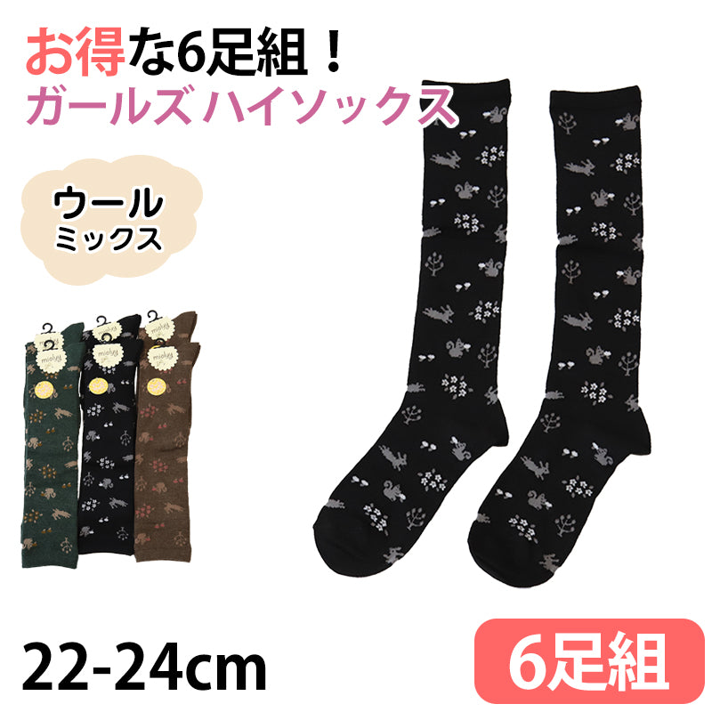 【 お得 】 ハイソックス ガールズ キッズ ウール 羊毛 6足組 22-24cm (くつした くつ下 ハイソックス ジュニアソックス ロング丈 ウール混) (在庫限り)