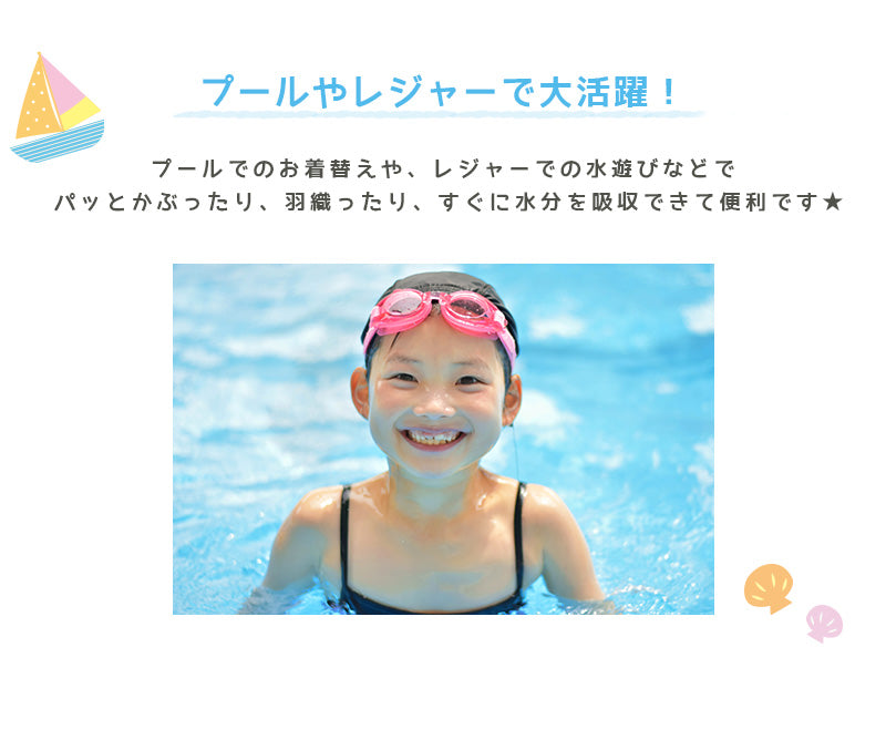 プールでのお着替えや、レジャーでの水遊びなどでパッとかぶったり、羽織ったり、すぐに水分を吸収できて便利です。