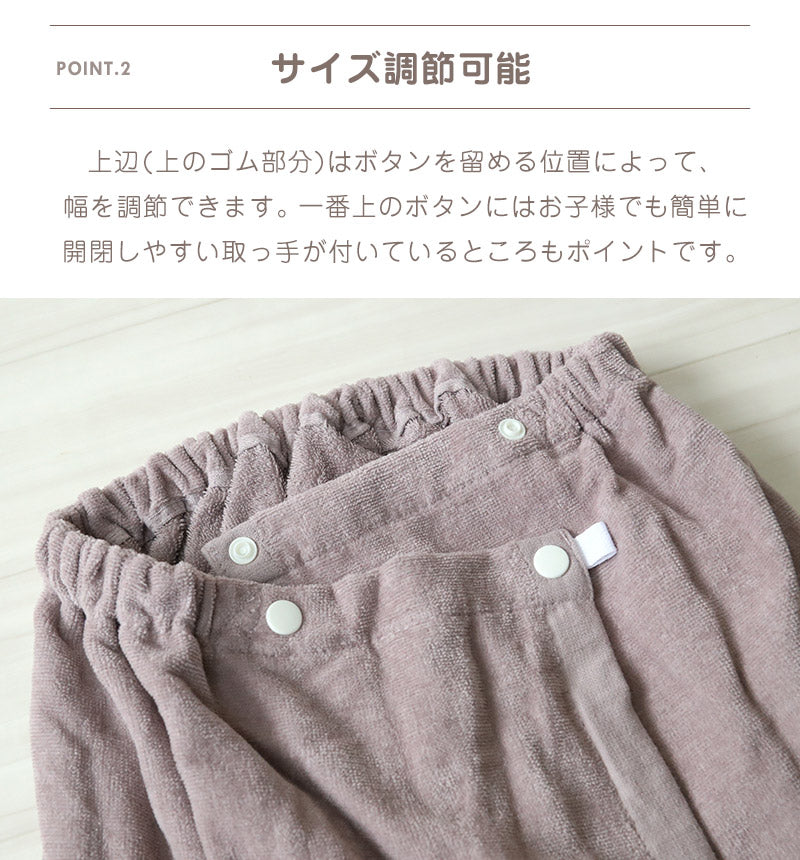 また、肌に直接触れる部分はパイル地で仕上げているので、体についた水分をしっかり吸収します♪