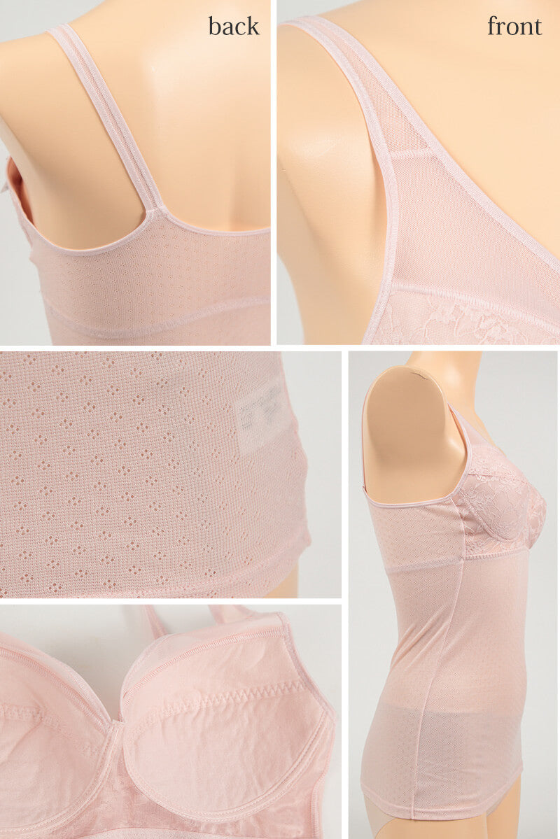 ブラジャー部分は『軽ブラ』と同じ軽い付け心地、身頃部分は速乾機能のある柄メッシュ素材で優しくフィット。