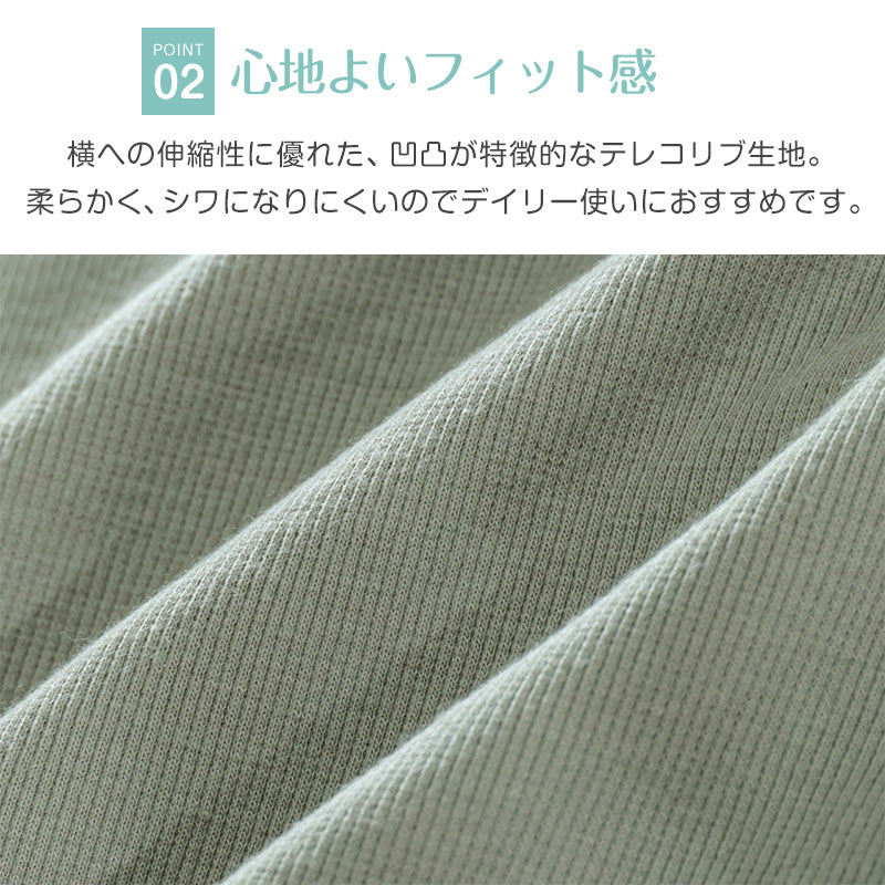 綿混素材の優しい肌ざわりと、伸縮性に富んだリブ編みで、動きやすくストレスフリーな着心地を実現。