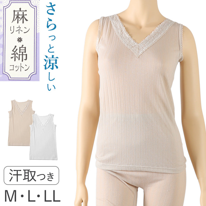 レディース ノースリーブ 綿 麻 タンクトップ 汗取り 脇汗パット インナー 肌着 M L LL