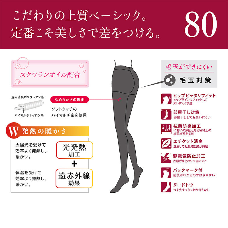ゾッキ編み W発熱(光発熱加工・遠赤外線効果) 毛玉ができにくい ヒップにフィットでズレにくい スクワランオイル配合 部屋干し対策 抗菌防臭加工 エチケット消臭 静電気防止加工 前後がわかりやすいバックマーク付き ヌードトウ(つま先切り替えなし) 80デニール 2足組