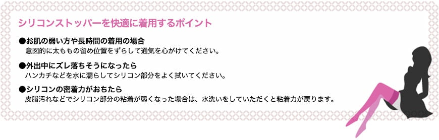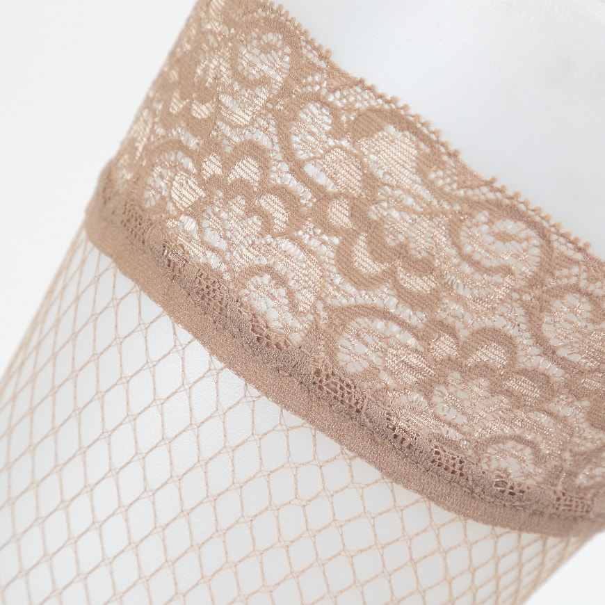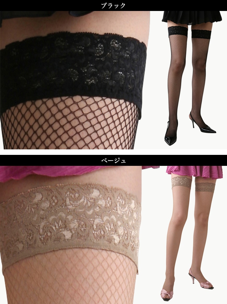 こちらはガーター不要、太ももでピタっと留まるシリコンストッパー付き太もも丈網タイツです。