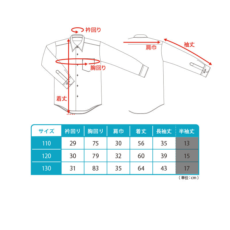 スナップボタンタイプのシャツは、110cm、120cm、130cmをご用意しました。