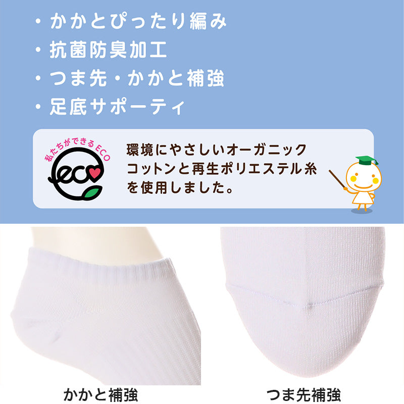 綿混、スクール用ソックス、かかとぴったり編み、表糸オーガニックコットン&再生ポリエステル使用、足底サポーティ、Yトウ、Yヒール、エキステンディットヒール、抗菌防臭加工、防汚加工(ホワイトのみ)、足型セット加工、ワンポイントなし(側面刺繍なし)