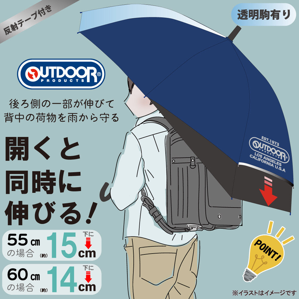 子供用 傘 後ろが伸びる 男の子 小学生 キッズ ランドセルが濡れない OUTDOOR 55cm 60cm